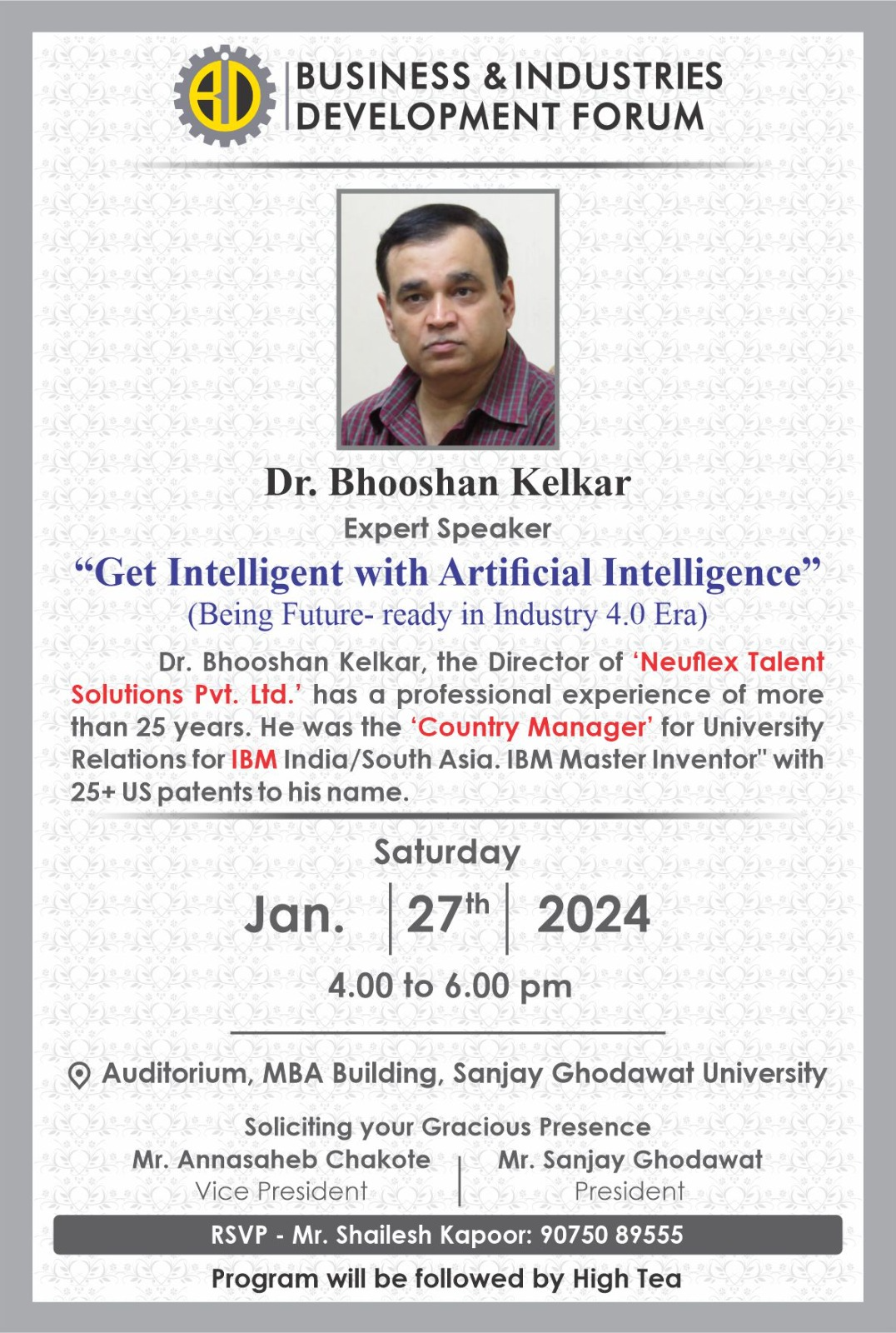 The Business and Industries Development Forum is established as a Trust by renowned industrialist Mr.Sanjayji Ghodawat to help the industries to come out of the financial crisis, to support the business and industries, to find out the solutions for various problems, to develop and upgrade the business and industry sector, to implement the new ideas in this sector considering application of changing technology.